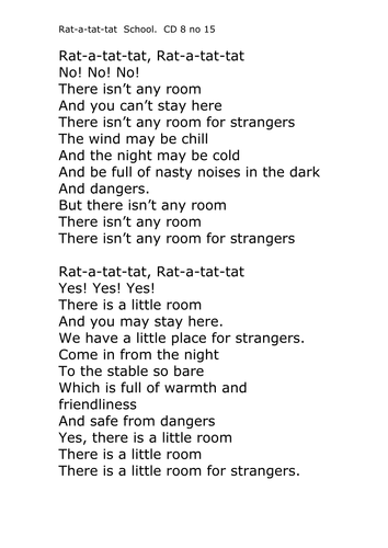 Rat a tat tat, rat a tat tat Yes! Yes! Yes! There is a little room and you can stay here, There is a little room for strangers. The night maybe cold And the wind maybe chill And full of nasty noises in the dark Nursery Christmas Songs Author: ... Access Doc